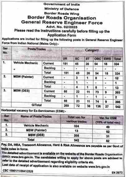 BRO Various Post Recruitment 2025: अगर आप कक्षा 10वीं पास हैं और बॉर्डर रोड्स ऑर्गनाइजेशन (BRO) में नौकरी करना चाहते हैं, तो आपके लिए एक शानदार मौका आया है क्योंकि सड़क सुरक्षा संगठन (BRO) ने Vehicle Mechanic, MSW (Painter, DES) समेत कई पदों पर भर्ती के लिए Official Notification जारी कर दी है। इस भर्ती के तहत कुल 542 पदों पर आवेदन आमंत्रित किए गए हैं और उम्मीदवार 11 अक्टूबर 2025 से 24 नवंबर 2025 तक ऑनलाइन माध्यम से आवेदन कर सकते हैं।