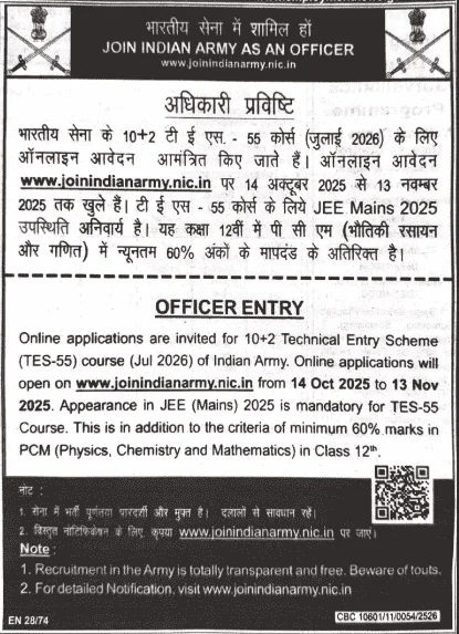 Indian Army TES 55 Recruitment 2025: अगर आप 12वीं पास हैं और देश की सेवा करते हुए एक प्रतिष्ठित करियर बनाना चाहते हैं, तो यह मौका आपके लिए बिल्कुल सही है। Indian Army ने Technical Entry Scheme (TES) 55 Recruitment 2025 के तहत लेफ्टिनेंट के 90 पदों पर भर्ती के लिए आधिकारिक अधिसूचना जारी कर दी है। इस भर्ती के लिए ऑनलाइन आवेदन प्रक्रिया 14 अक्टूबर 2025 से शुरू होकर 13 नवंबर 2025 तक चलेगी।